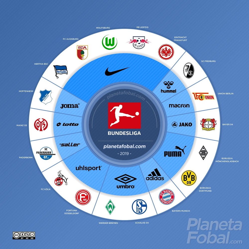 Wie in der letzten Saison führt Nike mit fünf Teams, die auch die gleichen sind wie 2018/19: Wolfsburg, FC Augsburg, Eintracht Frankfurt, Hertha Berlin und RB Leipzig. Drei Marken teilen sich den zweiten Platz - Puma mit Borussia Dortmund und Borussia Mönchengladbach, Umbro mit Werder Bremen und Schalke 04 und uhlsport mit Fortuna Düsseldorf und dem aufgestiegenen FC Köln.