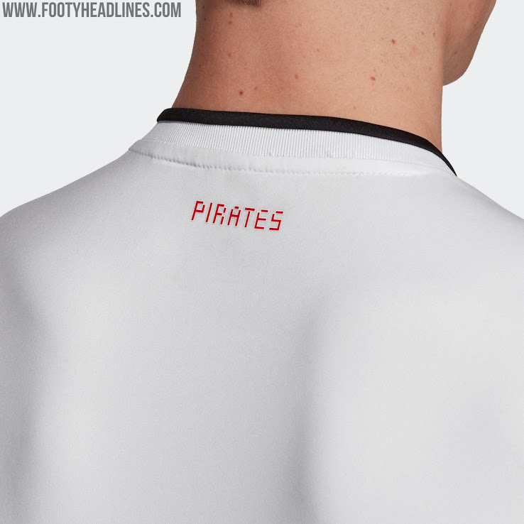 Es befindet sich auch eine dünne schwarze Linie um den Kragen und die Ärmelenden, während die Drei Streifen an den Seiten des neuen Orlando Pirates 2019-2020 Trikots grau sind. "PIRATES" steht auf der oberen Rückseite des neuen Orlando Pirates Heimtrikots gedruckt, direkt unter dem Kragen.