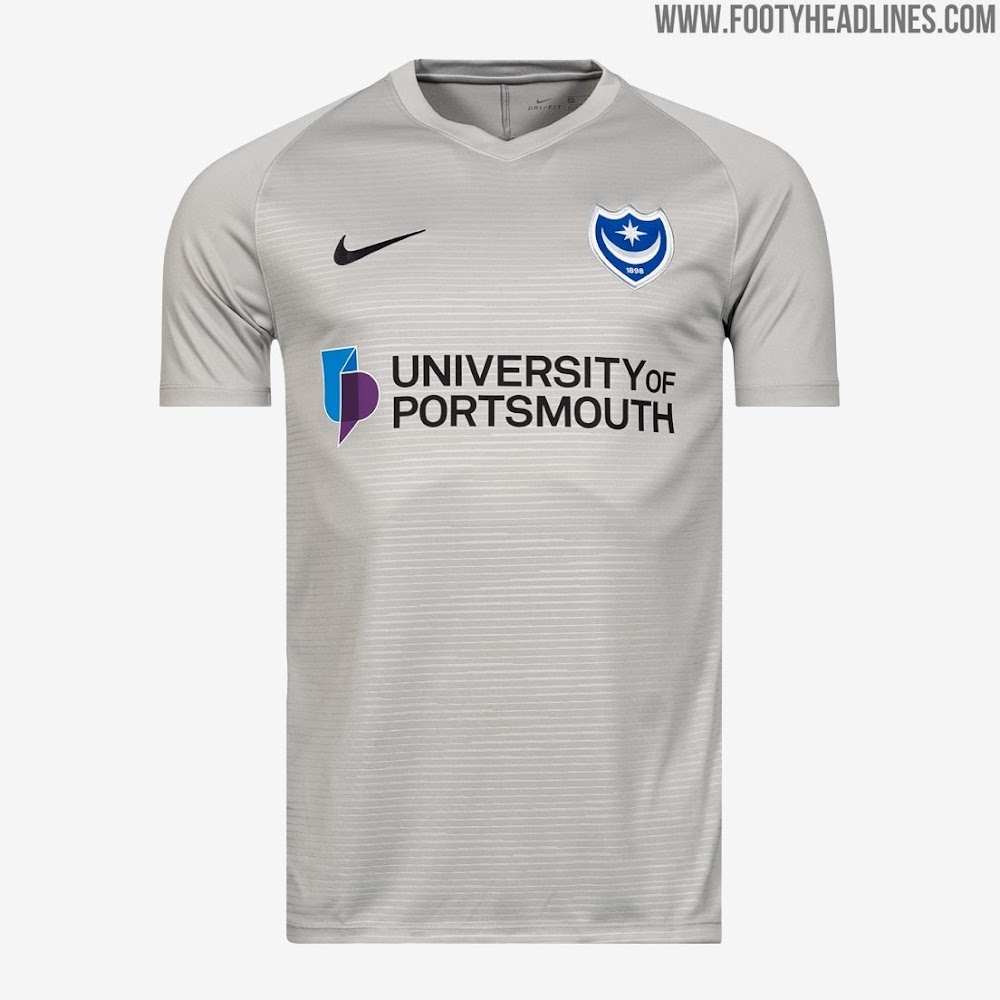 Das neue Portsmouth 19-20 Trikot basiert auf Nike Tiempo Premier Teamwear und ist hauptsächlich hellgrau mit schwarzen Akzenten auf den Seiten des Trikots. Auf der Vorderseite sind dezente tonale Nadelstreifen vorhanden.