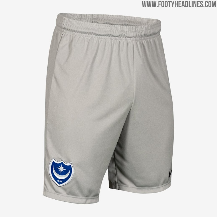 Graue Hosen und Stutzen runden das neue Nike Portsmouth FC 2019-20 Trikot ab.