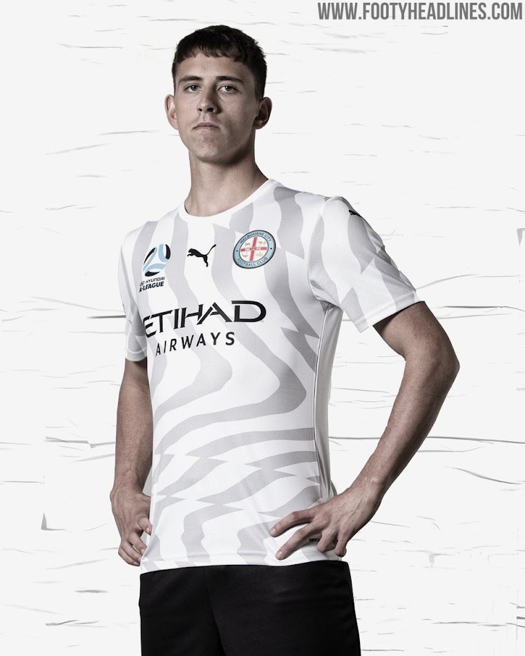 Das neue Melbourne City 19-20 Trikot liefert ein modernes Design und ist weiß mit einem grauen Grafikdesign und schwarzen Logos.