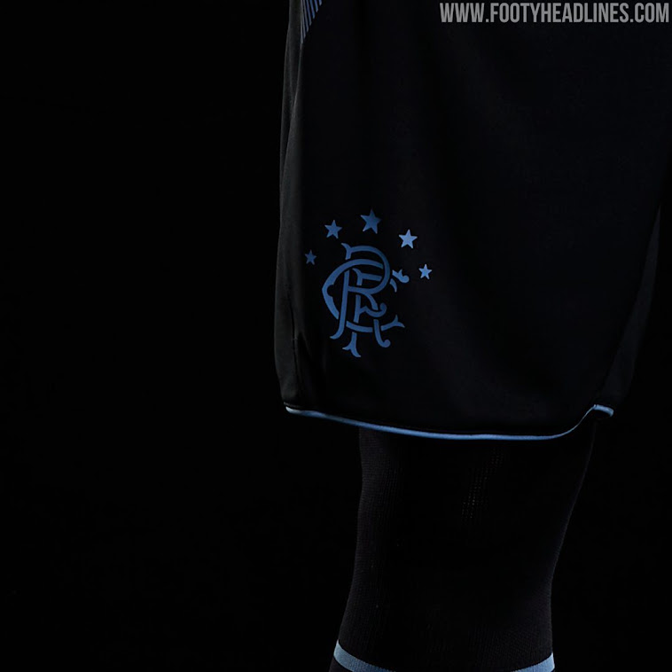 Schwarze Hosen und Stutzen vervollständigen das neue Hummel Rangers 2019-20 Trikot.