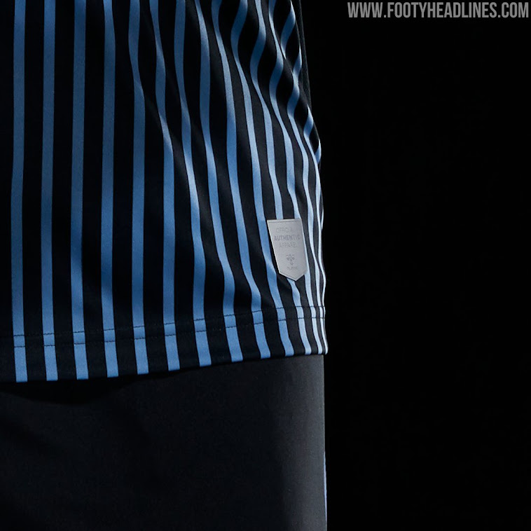 Das neue Rangers 2019-20 Trikot liefert einen eleganten Look und ist hauptsächlich schwarz mit einem blauen, verblassenden Streifenmuster, das zum unteren Saum hin sichtbar ist.
