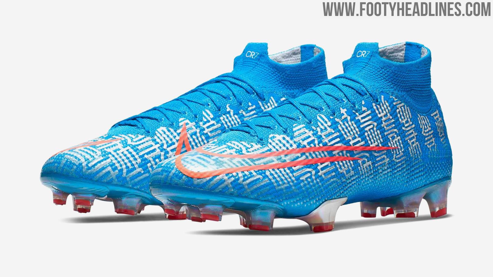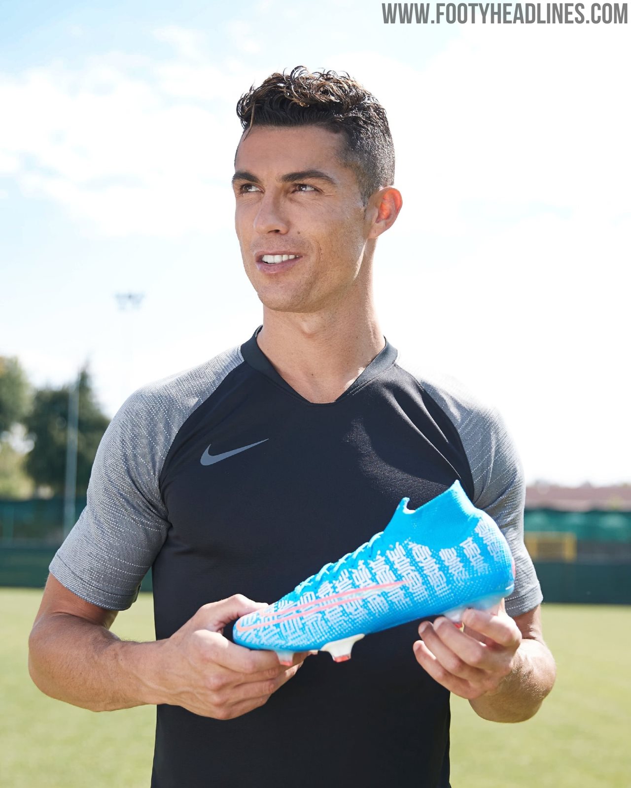 Die neuen Nike Mercurial Superfly Cristiano Ronaldo Shuai Fußballschuhe sind hellblau mit einem rosa Swoosh und einem allumfassenden chinesischen Schriftmuster in Weiß. Der chinesische Text auf der Oberseite lautet "Tong Shuai", was übersetzt "Modischer Kommandant" bedeutet.