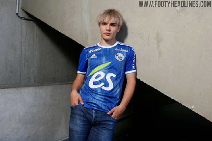 Adidas kombiniert das Straßburg 2019-2020 Trikot mit blauen Hosen und weißen Stutzen.