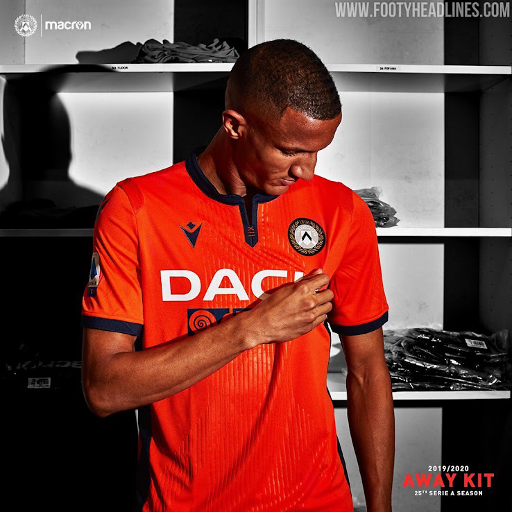 Das neue Udinese 19-20 Trikot ist orange mit einem marineblauen Kragen im koreanischen Stil. Ein zentrales Band auf dem Shirt besteht aus vertikalen Nadelstreifen und einer geprägten Nachbildung der Berge von Friuli.