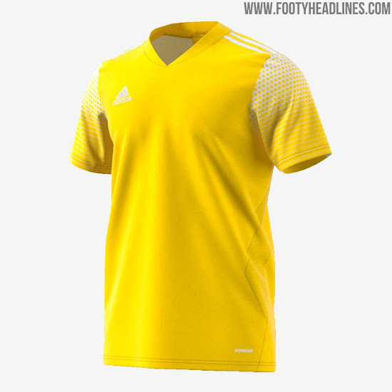 Das Adidas Regista 20 Trikot hat einen moderneren, direkteren Look als das Condivo. Das Shirt hat einen einfachen Kragen und einen dezenten Farbübergang auf den Ärmeln. Dieser Farbübergang nutzt einen sechseckigen Halbton-Effekt.