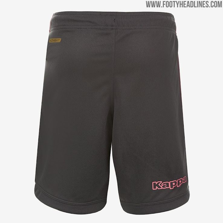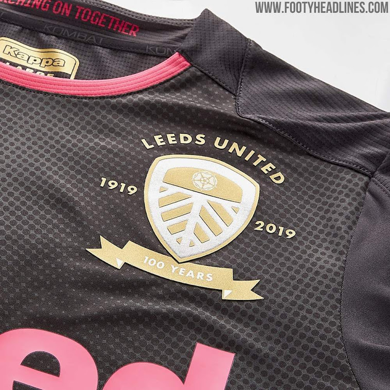 Das Leeds United 2019-2020 Trikot ist dunkelgrau mit hellen und auffälligen rosa Logos und Verzierungen.