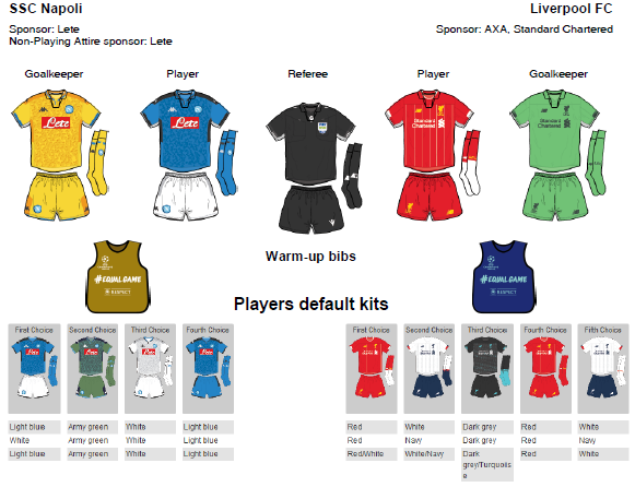Der UEFA-Bericht zeigt, dass Liverpool insgesamt fünf verschiedene Trikots registriert hat - die erste, zweite und dritte Wahl entspricht den Erwartungen, während die vierte und fünfte Wahl interessant sind. Die vierte ist das Standard-Trikot mit einfarbigen roten Socken, während die fünfte Wahl das Away mit einfarbigen weißen Stutzen ist.