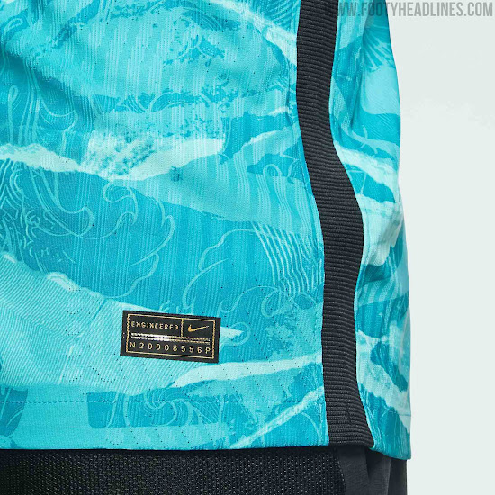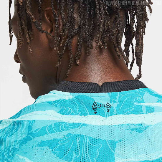 Das Nike Liverpool 20-21 Fussballtrikot ist überwiegend blaugrün ("Hyper Turquoise") mit schwarzen Logos und einem schwarzen Rundhalskragen, auf Grundlage des jetzigen Nike-Templates.