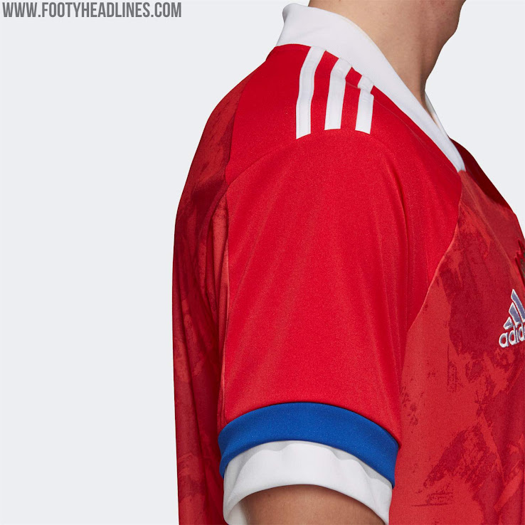 Das Russland EM 2020 Trikot, das auf dem Condivo 20 mit seinem großen Kragen und breiten Ärmelenden basiert, hat einen in Weiß gehaltenen Kragen und die Ärmelenden sind zwischen Blau und Weiß unterteilt. Dies bildet zusammen mit der Grundlage des Shirts die russische Flagge nach.