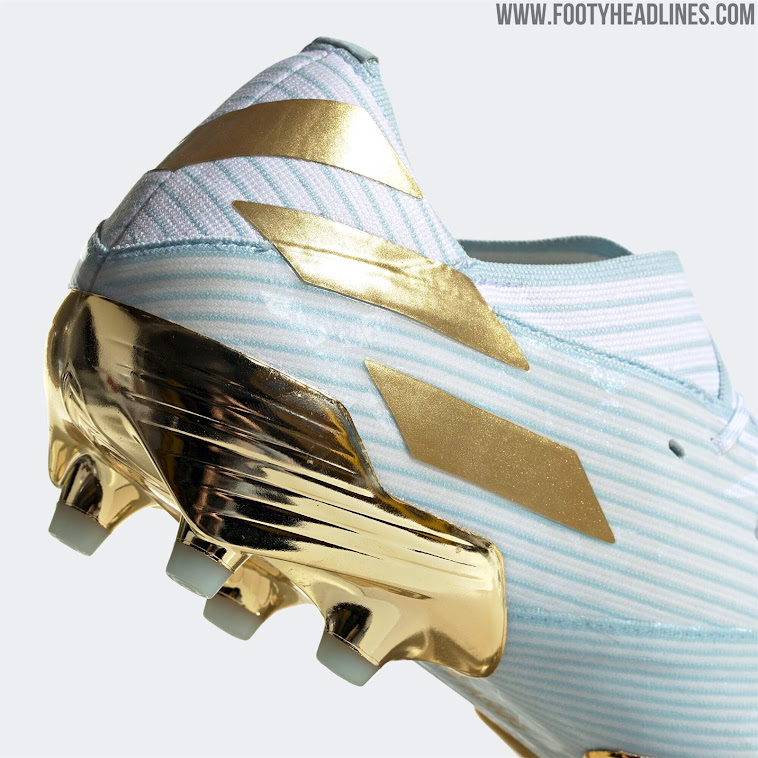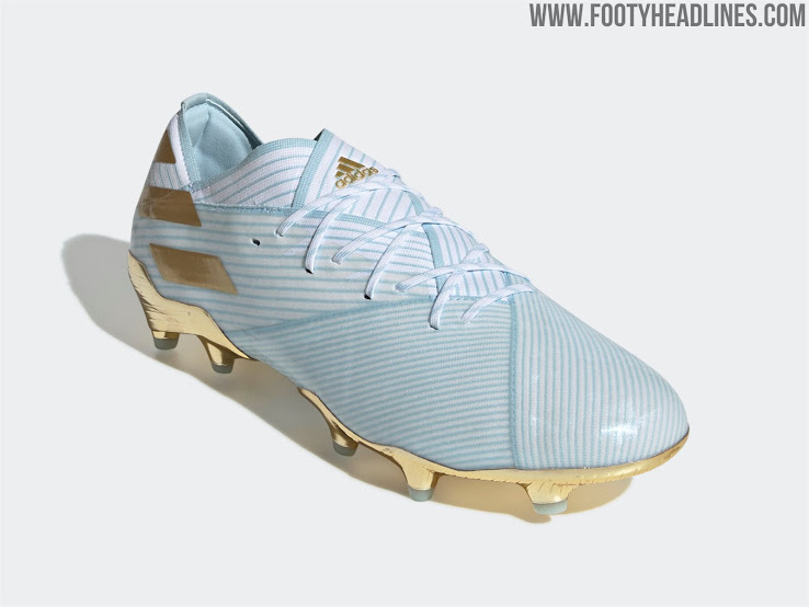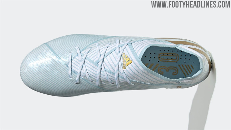 Basierend auf dem kürzlich eingeführten Nemeziz 19 sind die Schuhe überwiegend weiß mit einem dezenten hellblauen Muster und golden glänzenden Logos.