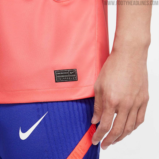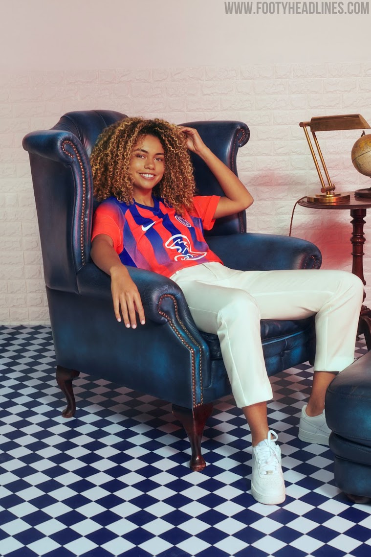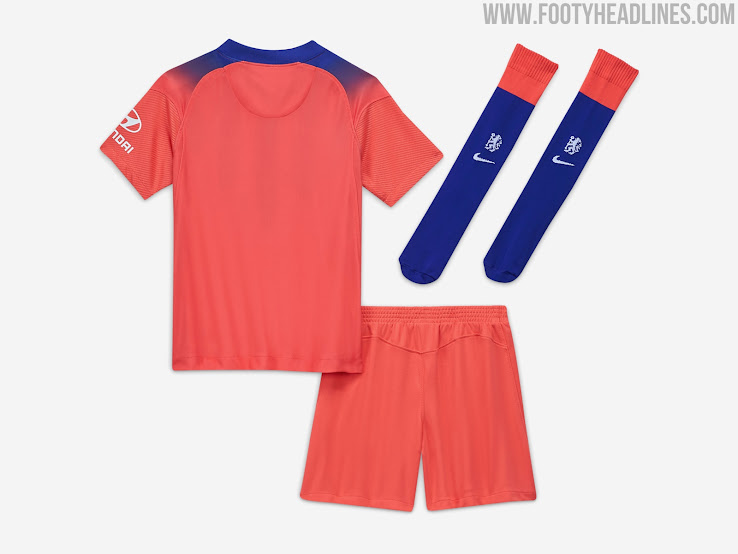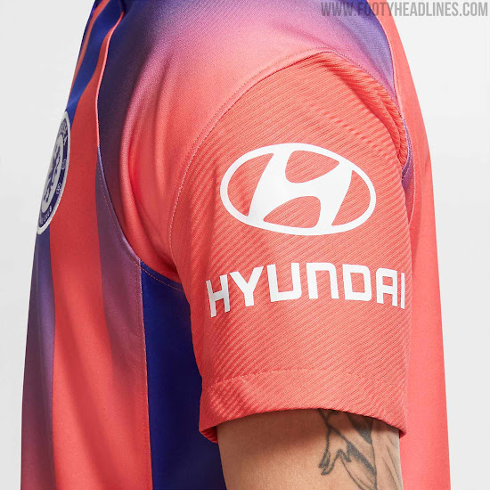 Das dritte Chelsea FC 2020-21 Trikot hat eine hellrote, fast rosa Grundfarbe, die mit einem dunklen und satten Blau kombiniert wird.