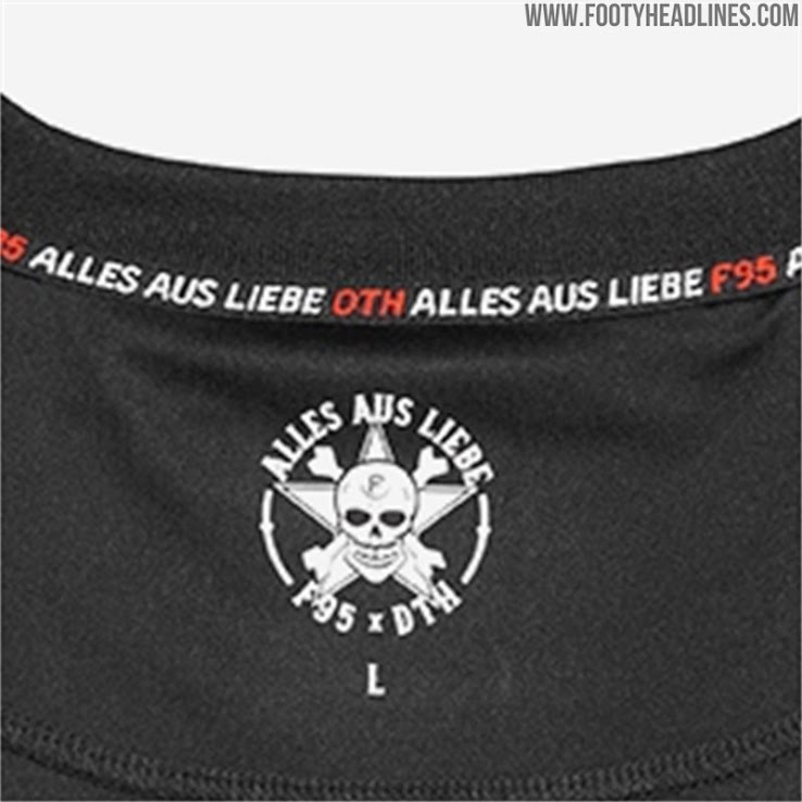 Dies wird durch eine Reihe weiterer kleinerer Details auf dem ganzen Trikot unterstrichen. "Alles aus Liebe" sowie "F95" und "DTH" sind auf dem inneren Halsband aufgedruckt. "Alles aus Liebe" ist auf der Rückseite des Halses bestickt und auf der rechten Seite befindet sich auch ein spezielles "F95 x DTH - Alles aus Liebe" Jock-Tag.
