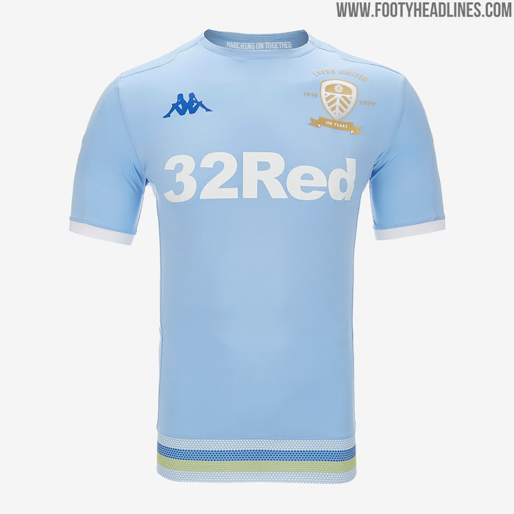 Das neue dritte Leeds United 2019-2020 Trikot ist himmelblau mit dem traditionellen blau / gelb / weißen Streifen am Bund und den Stutzen.