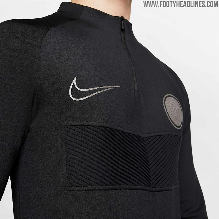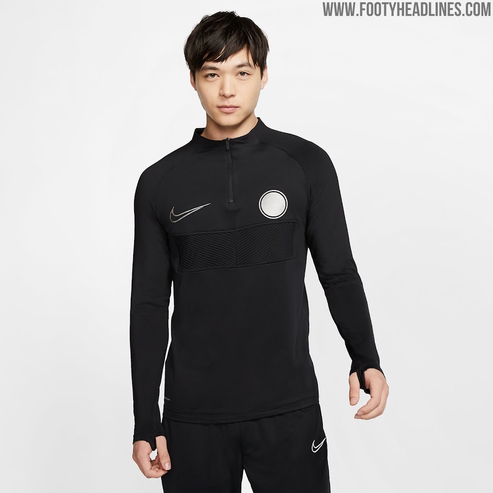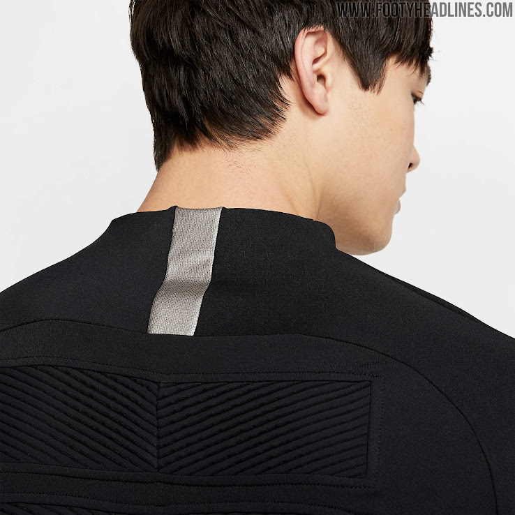 Die Nike Football AeroAdapt Strike Trainingsjacke ist in zwei Farben (Schwarz und Weiß) erhältlich und weist das AeroAdapt Material an drei Stellen auf: an einer auf der Vorderseite, wo sich das Sponsorenlogo auf einem Clubtrikot befindet, und an zwei auf der Rückseite, die die Platzierung von Namen und Nummern nachahmen.