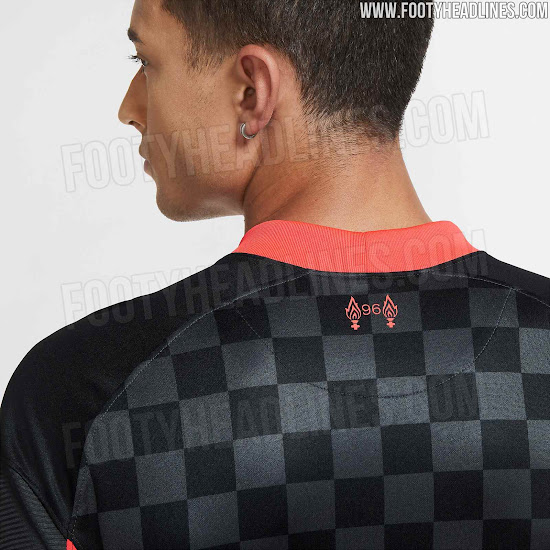 Das dritte Nike Liverpool 2020-21 Trikot ist schwarz mit einem grauen Schachbrettmuster auf der Vorder- und Rückseite.