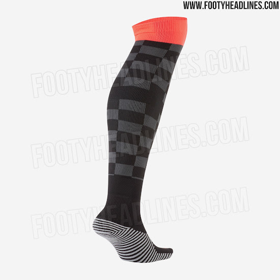 Die Hosen des Liverpool 2020-2021 Trikots sind schwarz mit einem roten Swoosh, während die Stutzen das gleiche Karomuster wie das Shirt aufweisen, kombiniert mit roten Logos und Details.