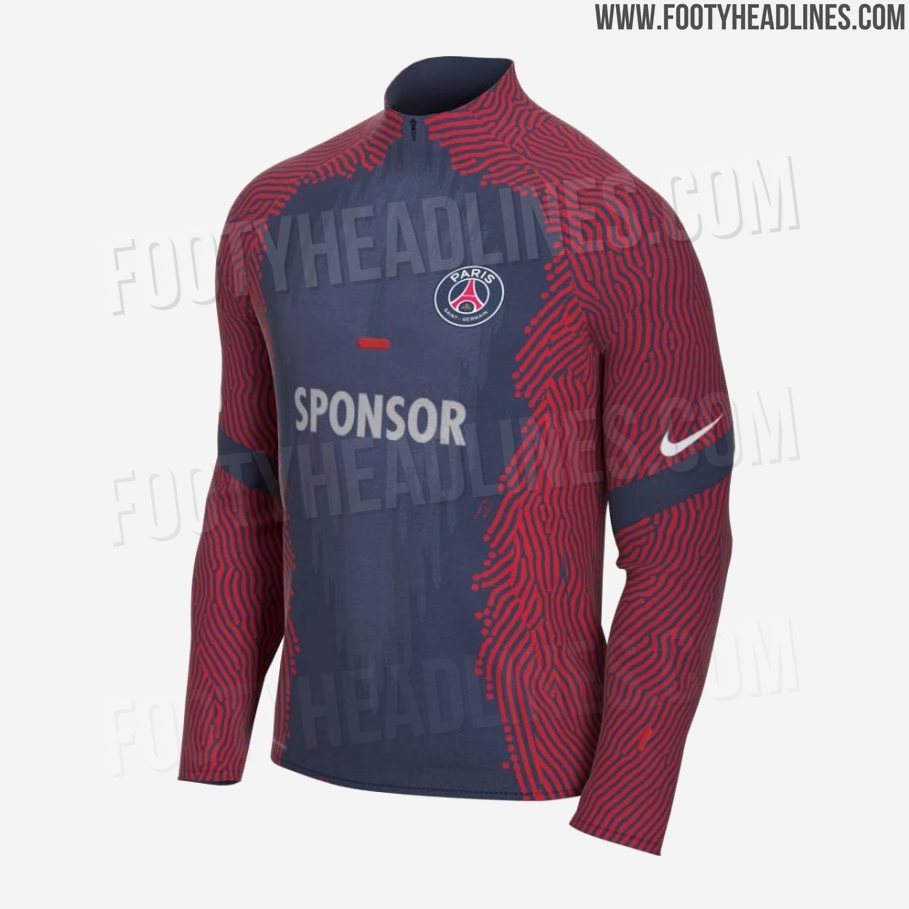 Das Paris Saint-Germain 2020-2021 Trainings-Trikot, das auf einem neuen Nike-Template basiert, ist überwiegend dunkelblau (gleiche Farbe wie das Heimtrikot) mit einer auffälligen dunkelroten Grafik, die den Großteil der Ärmel und Seiten des Trikots einnimmt.