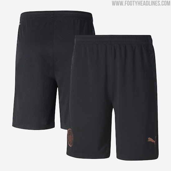 Schwarz / goldene Hosen und dunkelblau / goldene Stutzen komplettieren das Puma Manchester City 20-21 Trikot.