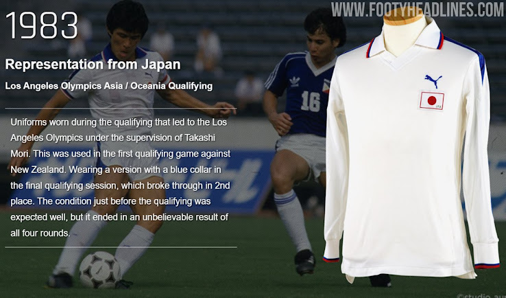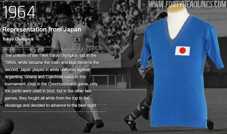 Japan verwendet Blau und Weiß statt Rot und Weiß aufgrund eines Aberglaubens. Japan benutzte blaue Trikots beim 3:2-Sieg gegen Schweden im ersten Spiel seines ersten großen internationalen Wettbewerbs, den Olympischen Sommerspielen 1936. Als Japan von Kenzo Yokoyama (1988-1992) trainiert wurde, waren die Trikots rot und weiß und entsprachen den Farben der japanischen Nationalflagge. Nach dem Scheitern der Qualifikation für die FIFA Fussball-Weltmeisterschaft 1990 und die Olympischen Sommerspiele 1992 wurde das rote Trikot verworfen.