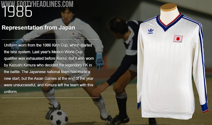 Das Design der Nationalteam-Trikots wurde in der Vergangenheit mehrfach überarbeitet. In den frühen 1980er Jahren war das Trikot weiß mit blauen Zierleisten. Die Trikots für den Asien-Pokal 1992 bestanden aus weißen Streifen (stilisiert zu einem Flügel) mit roten Diamanten. Während des ersten WM-Auftritts Japans 1996 im Asien-Cup und 1998 waren die Trikots der Nationalmannschaft blaue Trikots mit roten und weißen Flammen an den Ärmeln, die von JFA entworfen wurden (wobei der Sponsor jedes Jahr zwischen Asics, Puma und Adidas wechselte).