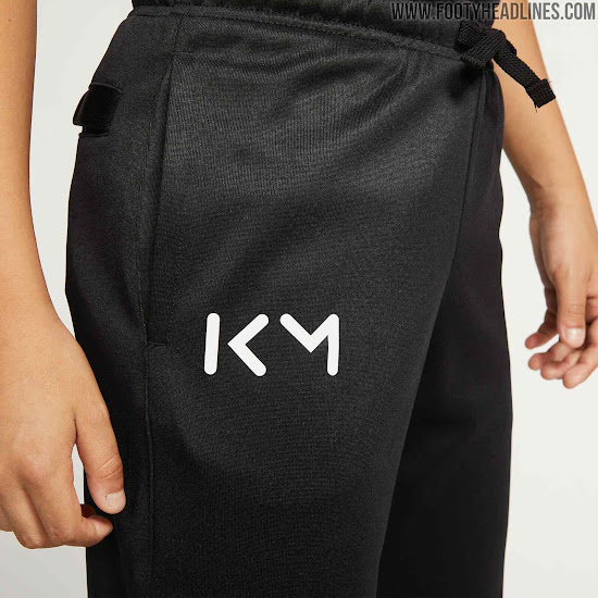 Die neue Nike Mbappe Black White Kollektion kombiniert einen schwarzen Sockel mit Weiß für den Soowsh und das Mbappe "KM" Signaturlogo. Das KM-Logo ist auf der Rückseite der Trikots prominent angebracht.