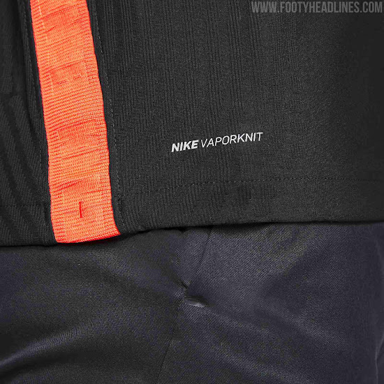 Das Nike Niederlande EURO 2020 Fussballtrikot führt ein elegantes Design in Schwarz und Orange ein. Das Shirt, das auf dem neuen Nike-Template basiert, ist einfarbig schwarz mit orangen Zickzackstreifen entlang der Seiten und einem Polokragen.