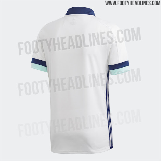 Es ist ein ungewöhnlicher Look für Nordirland: Eine weiße Grundlage wird mit einem hellen blaugrünen Kragen und marineblauen Ärmelbündchen kombiniert.