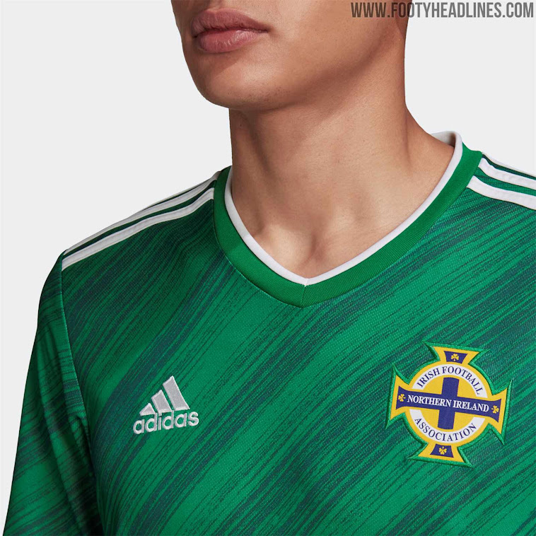 Dieses Detail ist inspiriert vom legendären Trikot-Design, das Nordirland in den 80er Jahren trug, als das Shirt auch diagonale Linien aufwies. Das Adidas-Designteam hat es umgebaut, indem eine starke Kombination aus unterschiedlichen Grüntönen und breiten Pinselstrichen verwendet wird, um Dynamik zu verleihen.