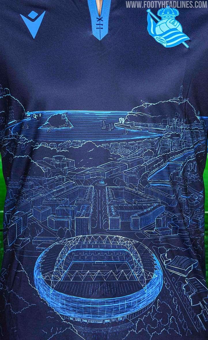 Das Macron Real Sociedad 2019-2020 Trikot ist dunkelblau mit königsblauen Logos und Details, einschließlich eines neu gefärbten Vereinswappens auf der linken Brust. Auf der Vorderseite ist ein stilisierter Blick auf die Stadt San Sebastián zu sehen, wobei das Anoeta-Stadion im Vordergrund steht.