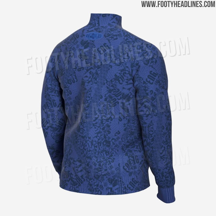 Inspiriert von den 90er Jahren, weisen sowohl die Jacke als auch der Trainingsanzug mutige Muster auf, die sich über das gesamte Design ziehen. Die Teile sind überwiegend blau, was die Farbe ist, die auch das Auswärtstrikot haben wird.