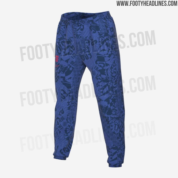 Das gleiche Muster ist auf dem Trainingsanzug zu sehen, wenn auch viel zurückhaltender. Sowohl das Oberteil als auch die Hose tragen das Muster in Marineblau auf Dunkelblau, kombiniert mit roten Logos.