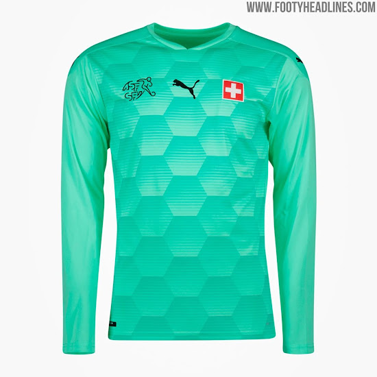 Das neue Schweiz-Torwarttrikot ist grün mit einem geometrischen Druck auf der Vorderseite und schwarzen Logos.