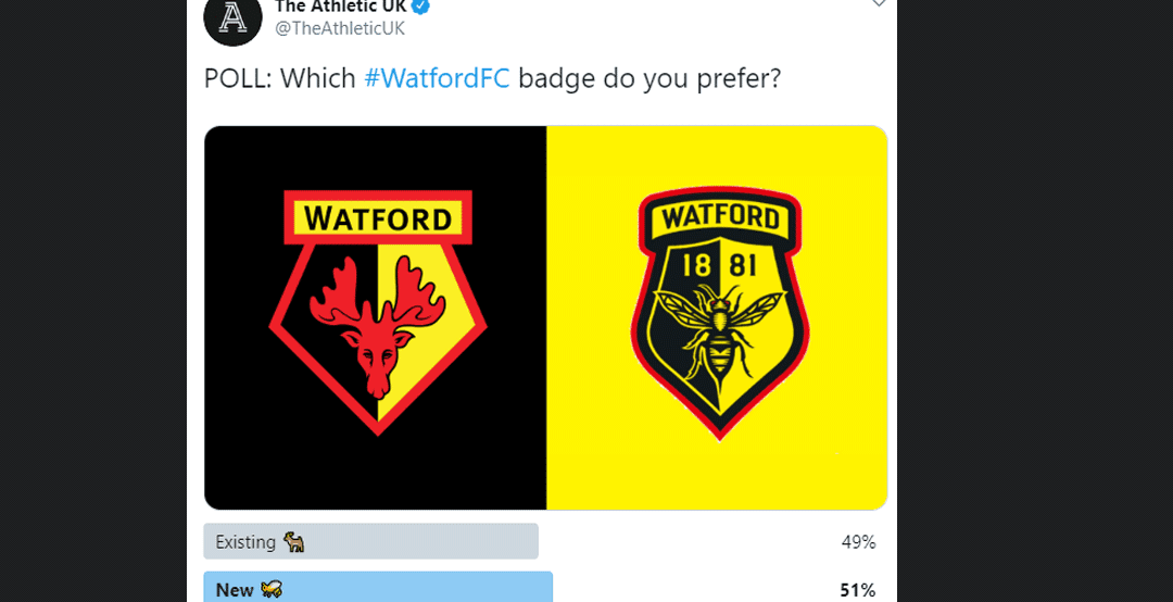 Update: Wie am Freitag bekannt wurde, wird das Watford FC Logo, das vom ehemaligen Adidas Marcus Dilley und Brian Gundell entworfen wurde und das wir Anfang dieser Woche ausführlich besprochen haben, gegen das aktuelle Wappen antreten. Der Gewinner der Abstimmung, die nächste Woche stattfinden wird, wird das offizielle Watford-Wappen der nächsten Saison.