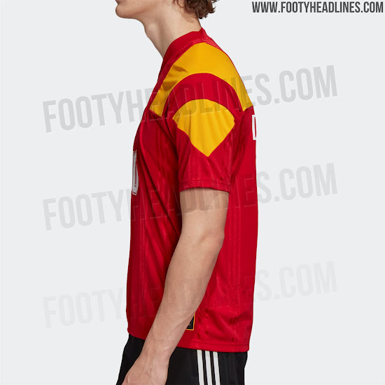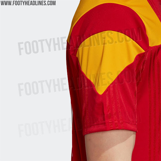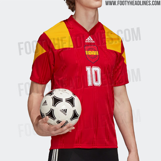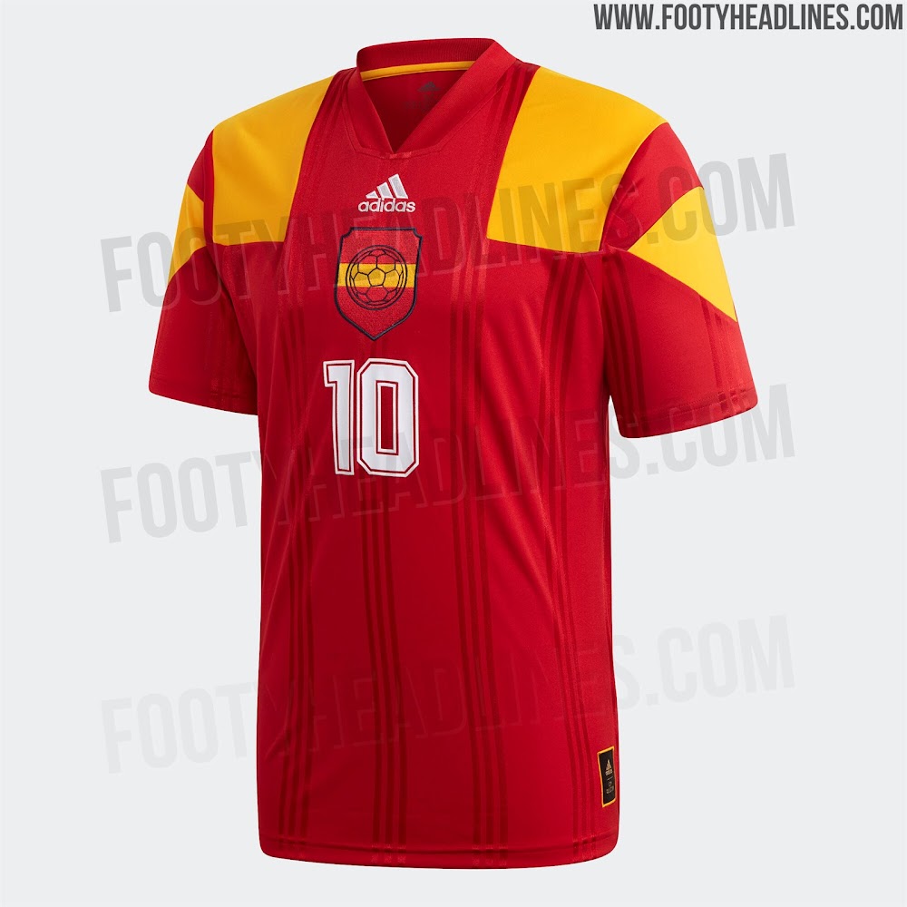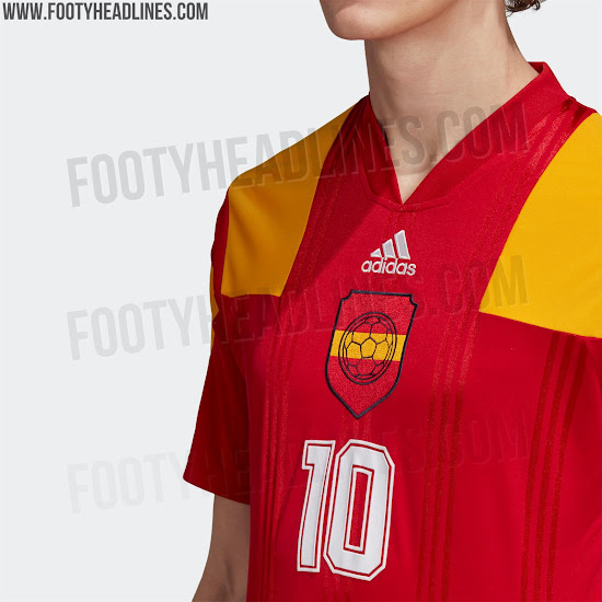 Das Trikot basiert auf der gleichen Vorlage, die wir bereits mehrmals in dieser Kollektion gesehen haben. Das Shirt ist rot mit einem großen 3-Streifen-Detail auf den Schultern in den Farben der spanischen Flagge.