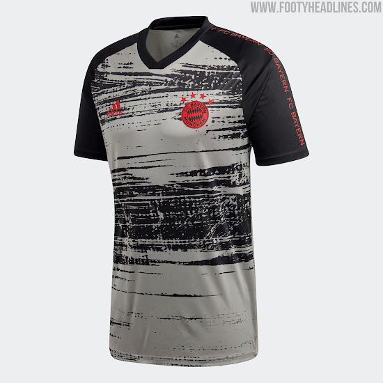 Das neue Bayern München 2020-21 Aufwärm-Trikot, das auf dem gleichen Template wie das von Manchester United basiert, das wir Euch vor ein paar Tagen gezeigt haben, ist grau mit schwarzen Raglanärmeln und einer mutigen Glitch-Grafik auf der Vorderseite, ebenfalls in Schwarz.