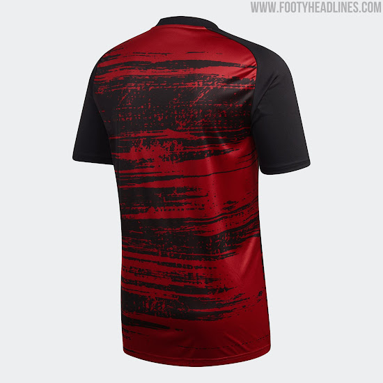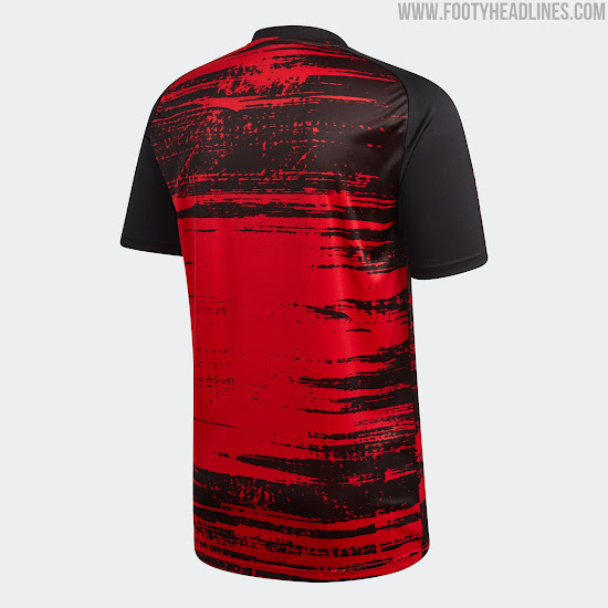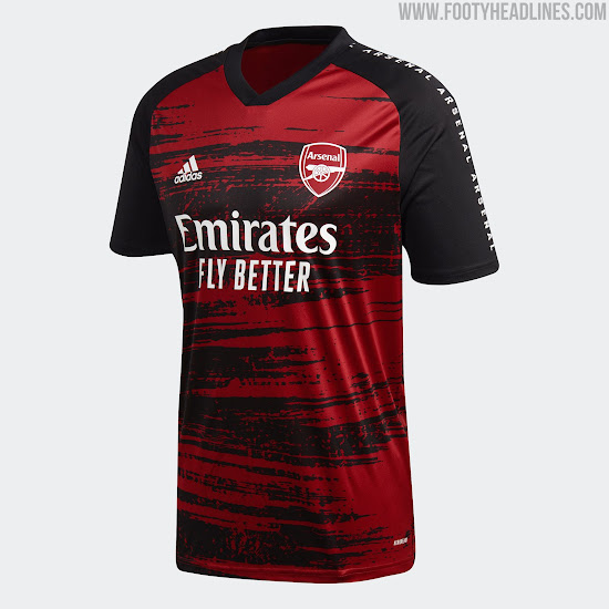 Das Adidas Arsenal FC 2020-21 Aufwärm-Trikot, das auf der gleichen Idee wie die Bayern- und ManU-Aufwärmtrikots basiert, ist überwiegend kastanienbraun, wobei sich die charakteristische Pinselstrichgrafik in Schwarz auf Vorder- und Rückseite befindet.