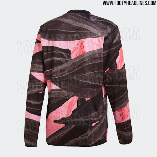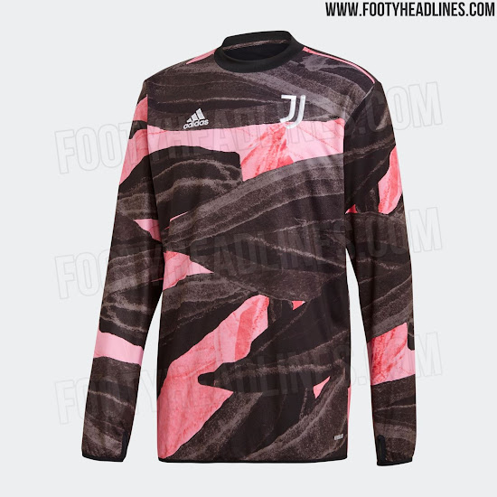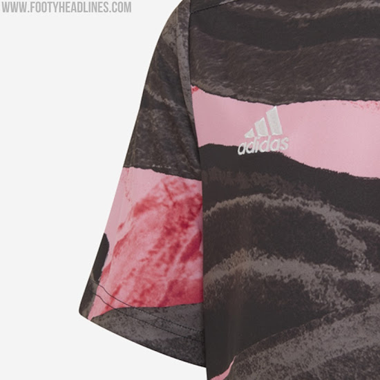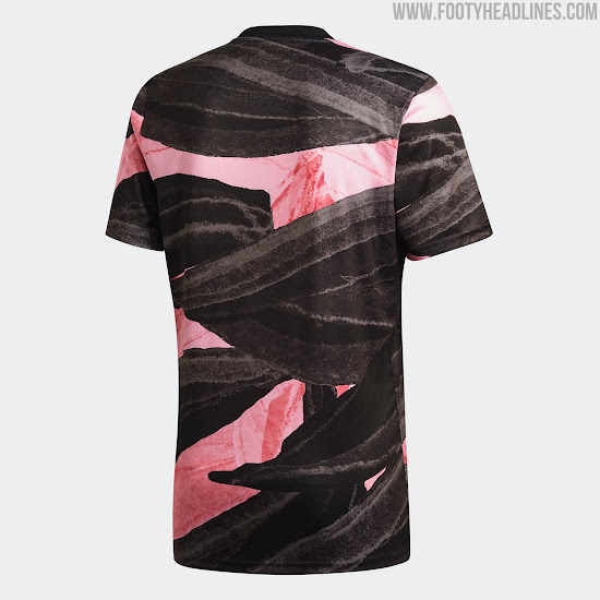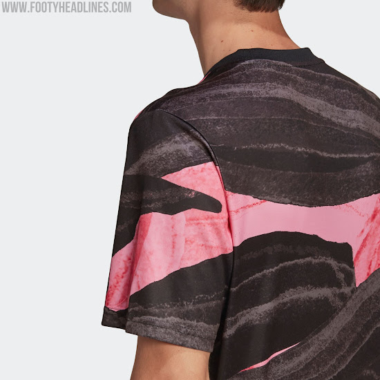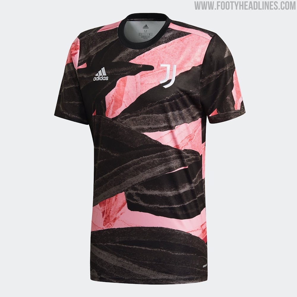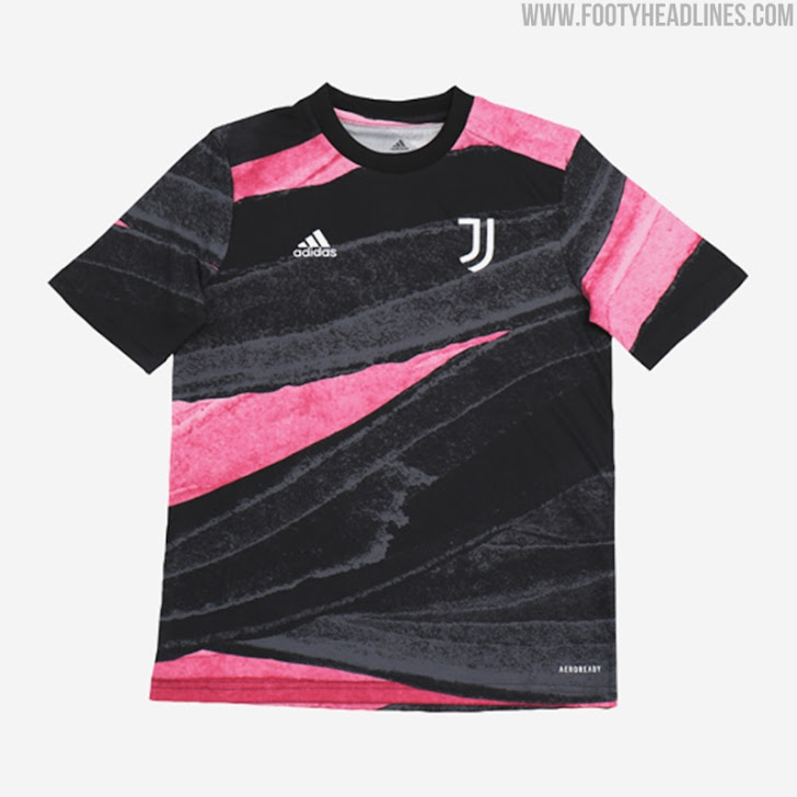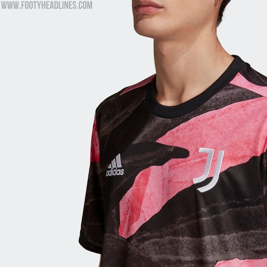 Das neue Adidas Juventus FC 2021 Pre-Match-Top hat ein auffälliges Design in Schwarz, Pink und Gold - es ist schwarz und pink mit einer Pinselstruktur auf der ganzen Fläche.