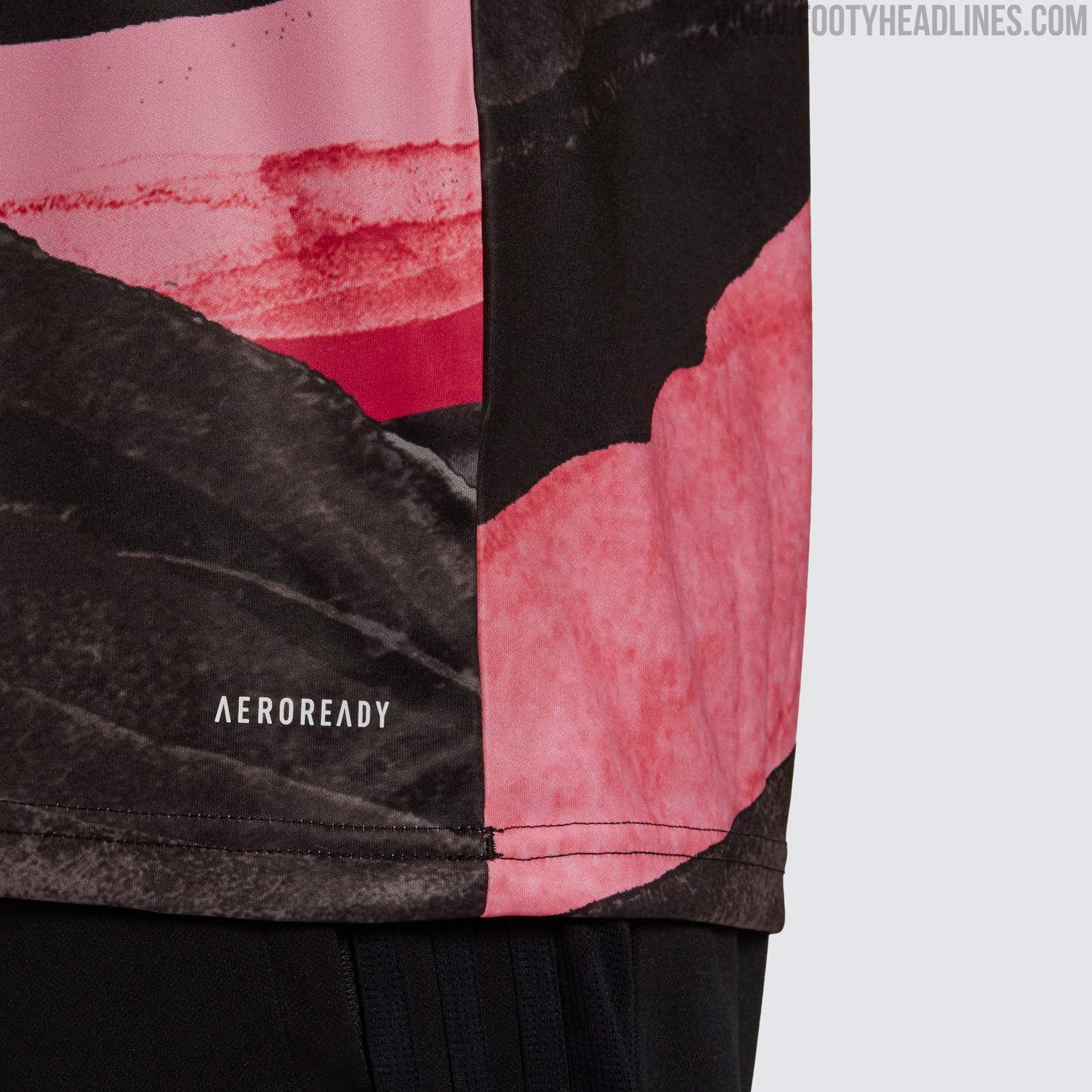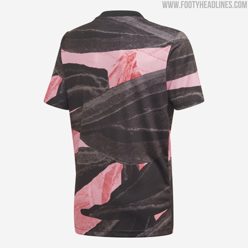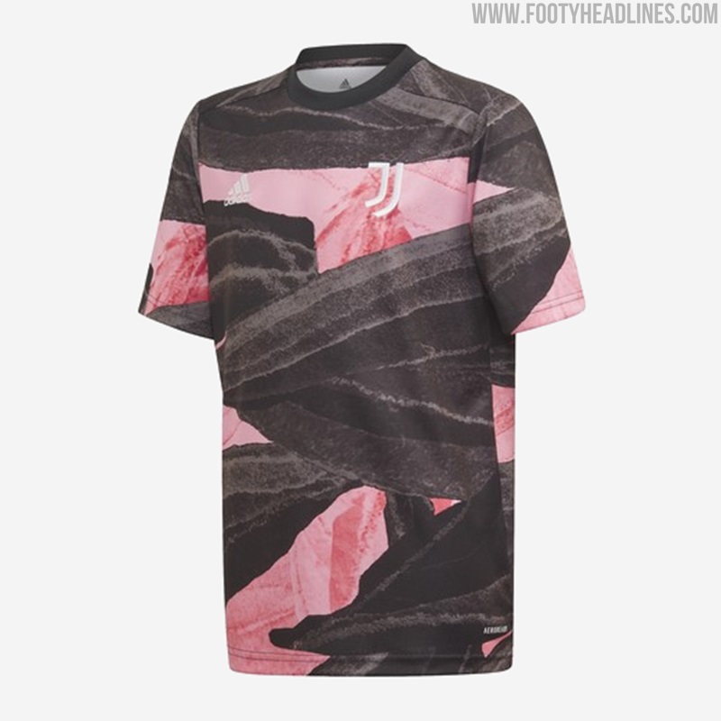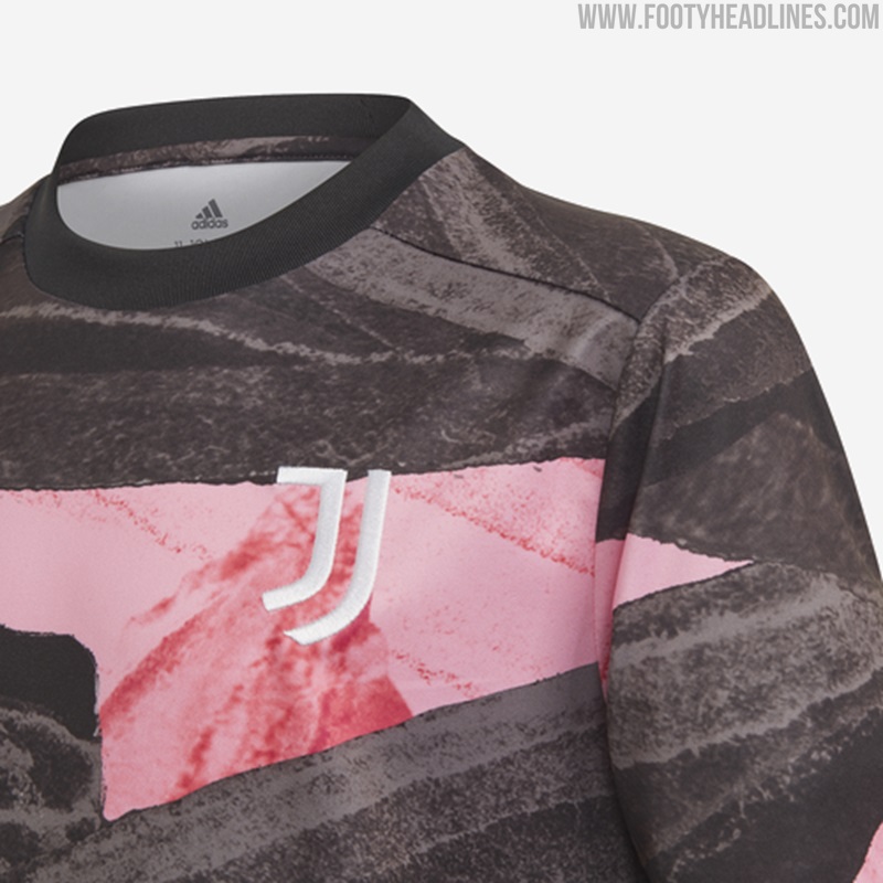 Das neue Adidas Juventus FC 2021 Pre-Match-Top hat ein auffälliges Design in Schwarz, Pink und Gold - es ist schwarz und pink mit einer Pinselstruktur auf der ganzen Fläche.