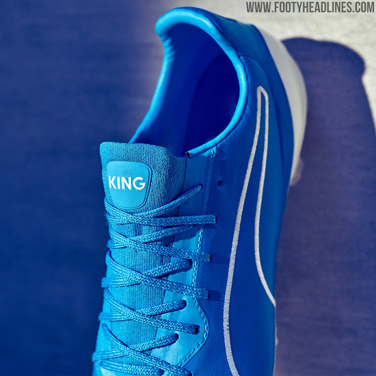Ein schlichtes Design, die neueste Puma King Platinum Farbe kombiniert die Hauptfarbe Luminous Blue mit Weiß für Logos und Details. Es ist eine Farbkombination, die perfekt zu Pumas neuestem großen Team, Manchester City, passt.