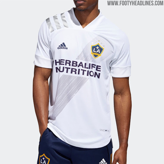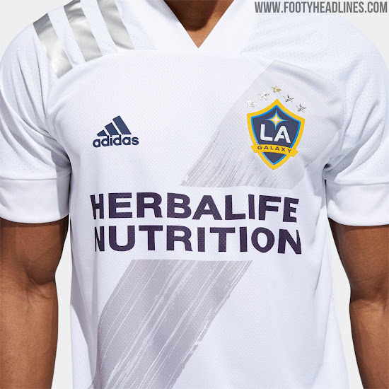 Das LA Galaxy 2020 Trikot ist überwiegend weiß mit einer silbernen Schärpe und silbernen Drei Streifen auf den Schultern. Es handelt sich um das neue, von 1994 inspirierte Template, das bereits für das neue Atlanta United Auswärtstrikot zum Einsatz kommt und exklusiv für die MLS entworfen wurde.
