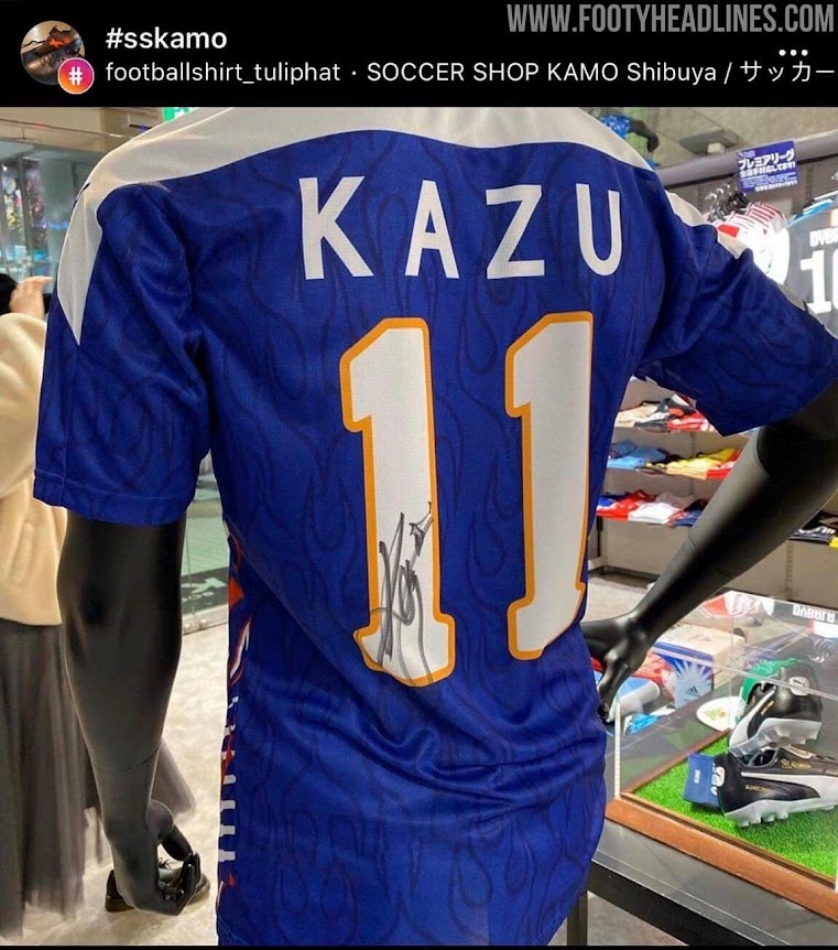 Das Shirt, das Kazu während der Veranstaltung am 21. Dezember trug, führt einen mutigen und farbenfrohen Look ein, der sich auf die legendären Japan 1994 (Puma) und 1998 (Asics) Trikots bezieht.