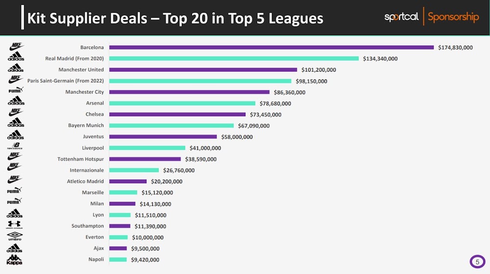 Zunächst ist zu beachten, dass alle Zahlen im Ranking der Sportagentur Sport Cal in US-Dollar angegeben sind, obwohl die meisten in Euro unterzeichnet wurden. Zweitens ist die Rangliste vom Beginn der Saison 2018-2019 und beinhaltet daher nicht Liverpool x Nike.