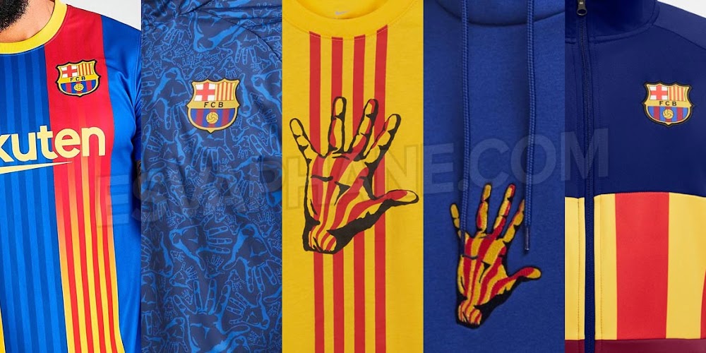 Die FC Barcelona Senyera 2020-21 Kollektion besteht aus mindestens fünf Gegenständen und dem Trikot. Sie weisen einzigartige Designs auf, die von der katalanischen Flagge und der fünfhändigen Geste von Pique inspiriert sind.