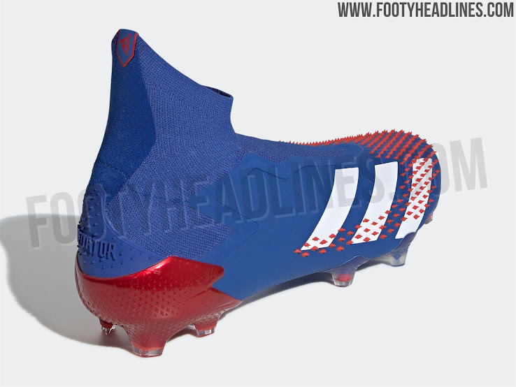 Die neuen Adidas Predator 20+ Fußballschuhe sind überwiegend königsblau mit weißen Drei Streifen und einer metallisch-roten Fersenkappe. Das Strickdetail am Schaft sowie die berühmten 406 Spikes auf dem Obermaterial sind ebenfalls rot und vervollständigen so die Farben, die für das dazugehörige Predator Mania Remake verwendet wurden.