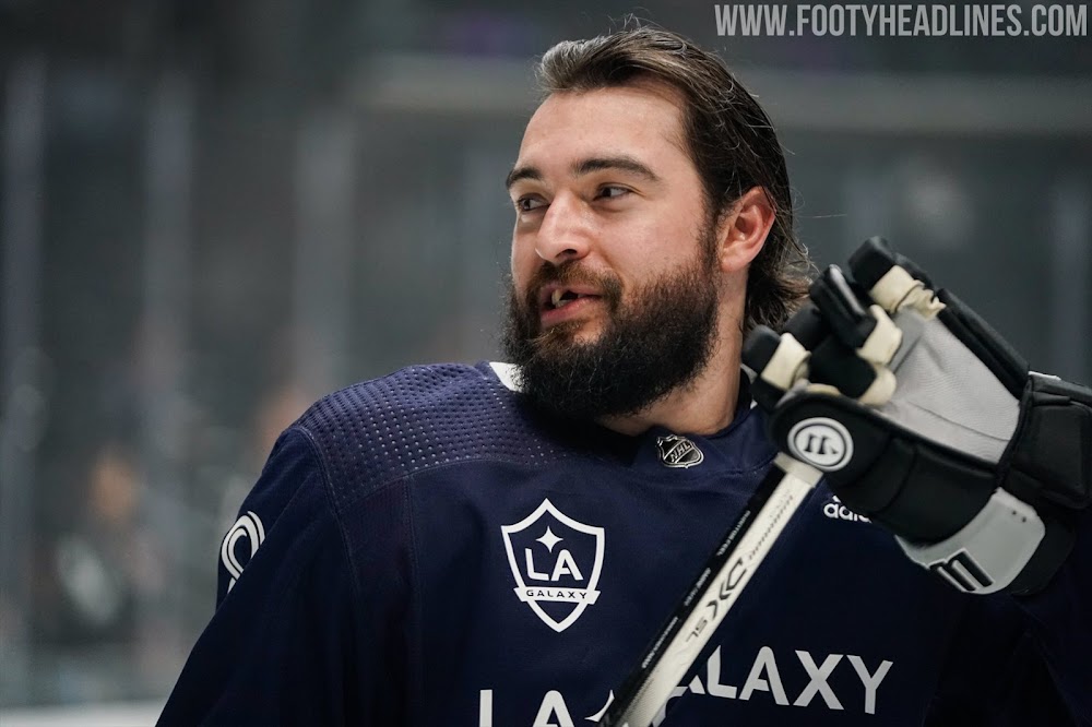 Das LA Kings x LA Galaxy NHL Trikot basiert auf dem Template des Adidas NHL Trikots und ist eine Mischung aus den Trikots der LA Galaxy und der LA Kings. Es ist marineblau mit weißen Details und verschiedenen Galaxy-Brandings.