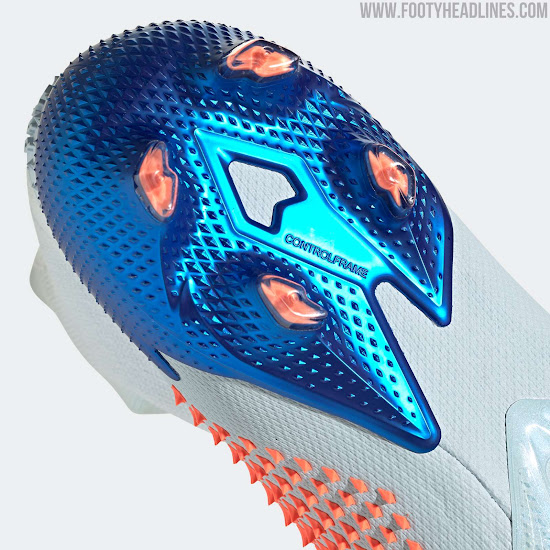 Dieser neue Adidas Predator 20+ ist überwiegend in einem sehr hellen und blassen Blauton gehalten. Er wird mit einem dunkleren Blauton (Drei Streifen, hintere Sohlenplatte) und einem leuchtenden Rot für das Markenzeichen "406 Spikes" kombiniert.
