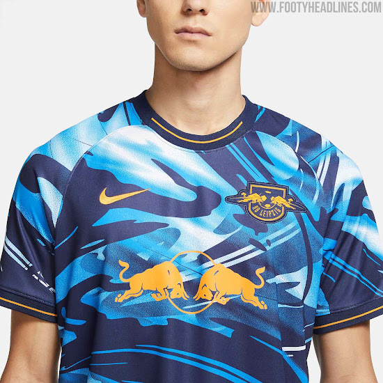 Nike kombiniert diese auffällige Farbkombination mit Orange ("Kumquat") für die Logos, darunter ein einfarbiges Logo Red Bull Leipzigs auf der linken Brust.