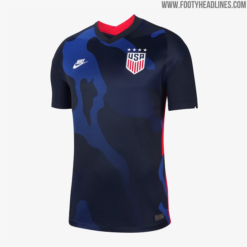 Das zweite USA 2020 Trikot, das auf dem gleichen Template basiert, ist überwiegend dunkelblau mit einem subtilen grafischen Druck auf der Vorderseite. Dieser Druck, der per Hand von den Designern gezeichnet wurde, ist inspiriert von jüngsten Camouflage-Trends in der Mode.